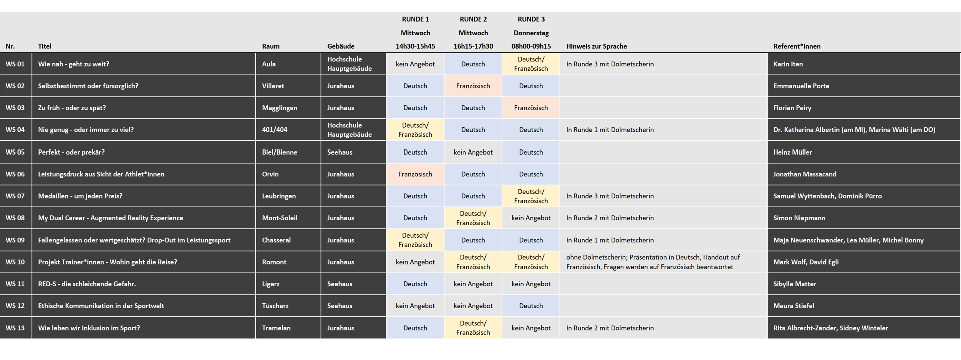 Hier werden die einzelnen Workshops vorgestellt. Du hast die Möglichkeit, drei Workshops zu besuchen. Eine Übersicht wann welcher Workshop wo und in welcher Sprache stattfindet findest du hier.